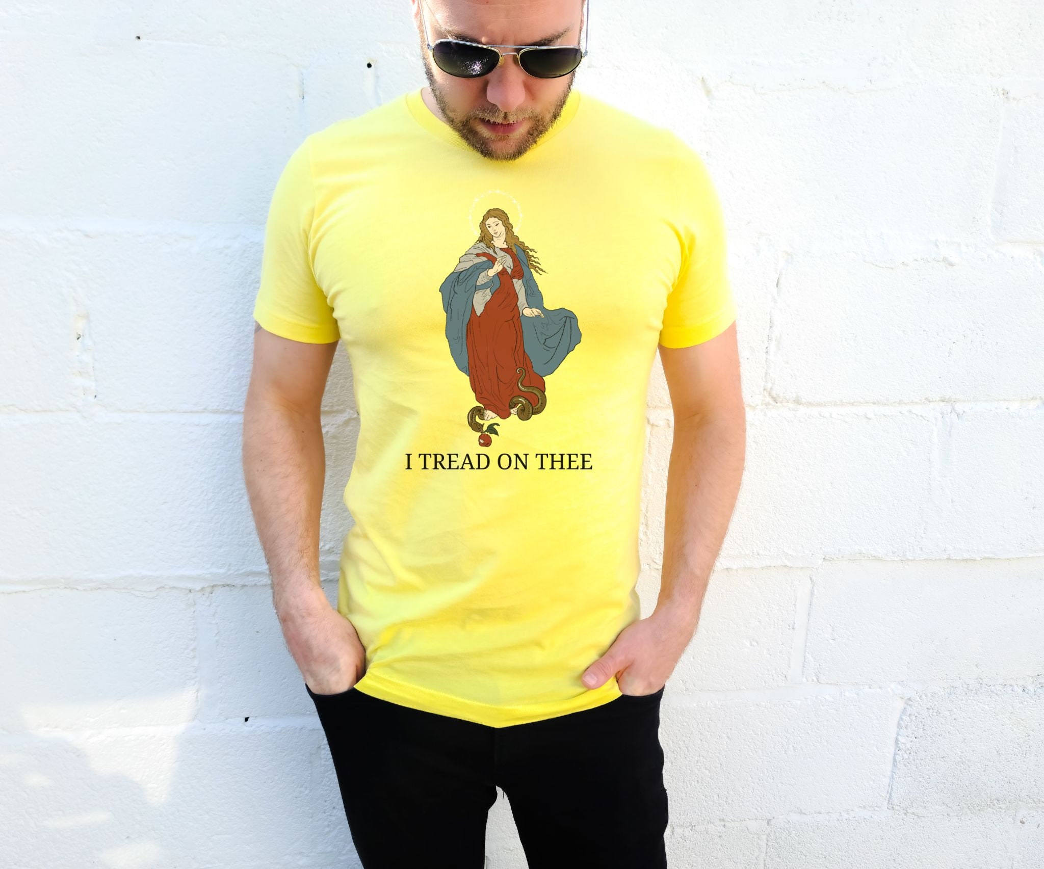 A parody of the famous Gadsden flag ("Don't Tread on Me") made with original digital artwork featuring the Blessed Virgin Mary crushing the serpent's head with the inscription "I tread on thee". Large full-color graphic on a classic fit yellow shirt.β¨