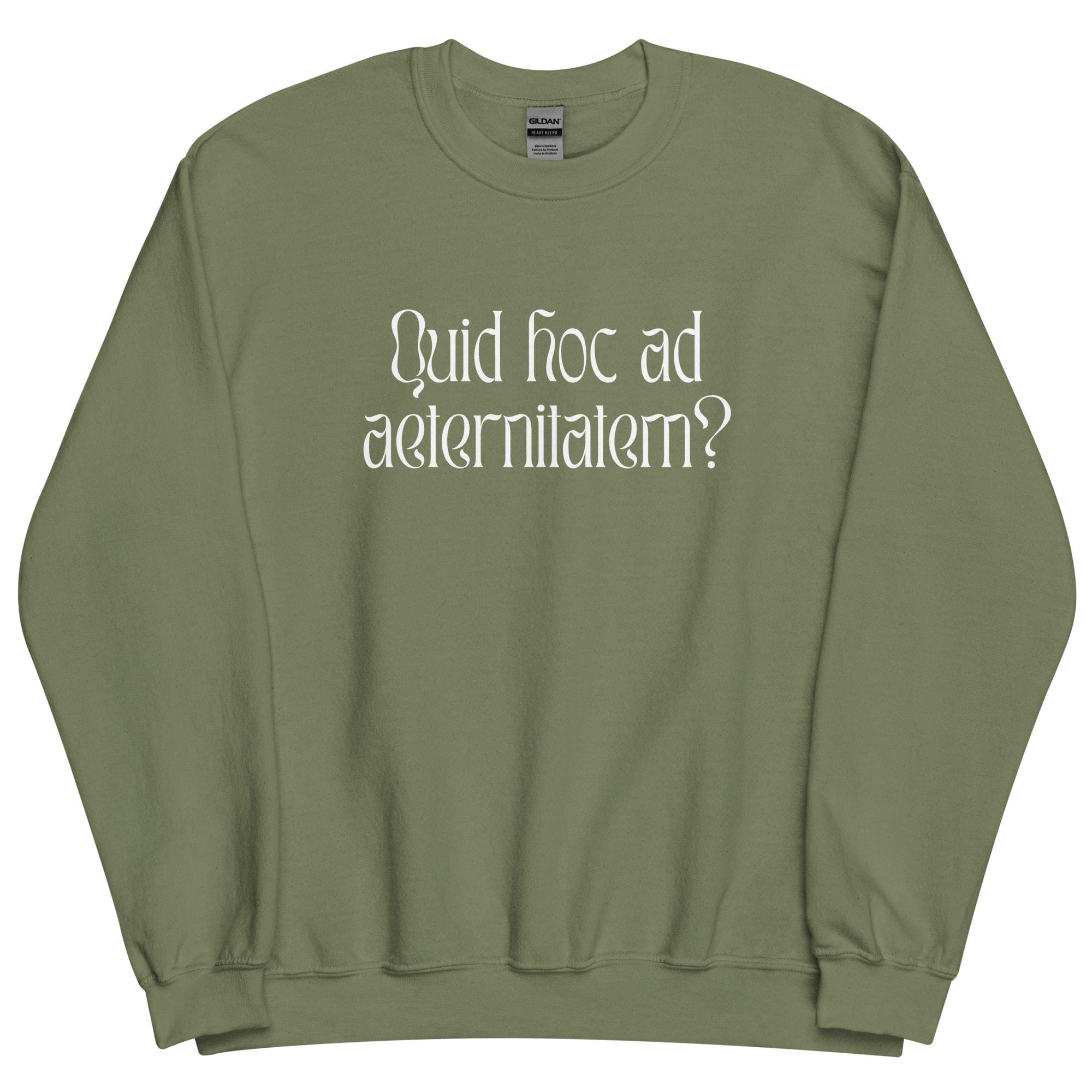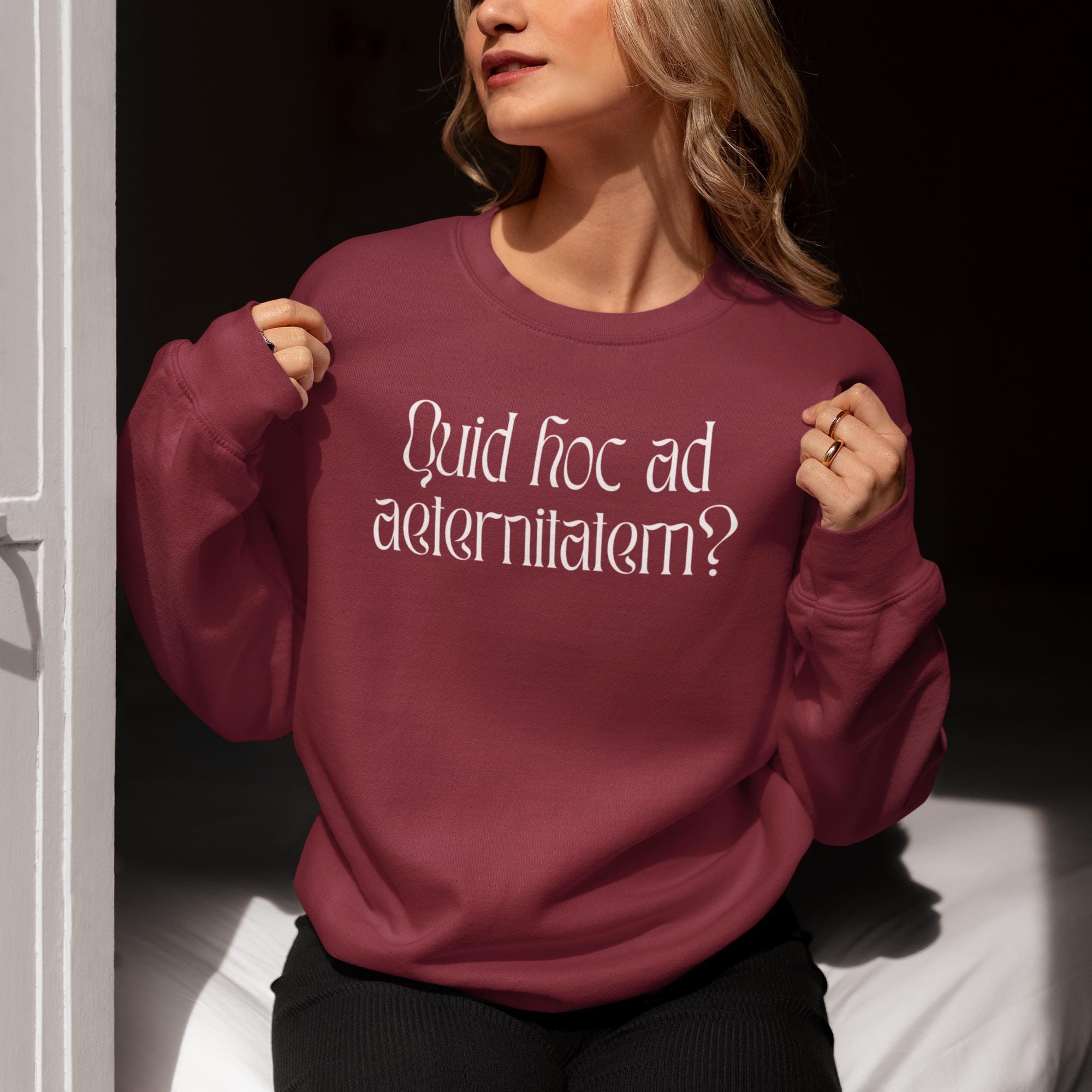 Here's the famous and profound inquiry in a fun wavy serif font, on a classic fit sweatshirt available in four bold colors.